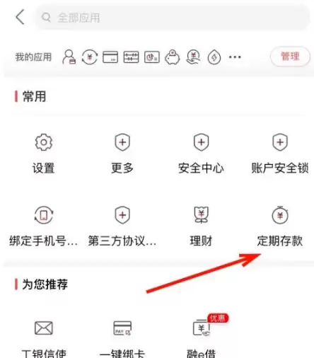 在金融产品分类中,定位"定期存款"功能入口,轻触该图标进入业务办理界面。