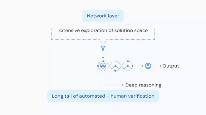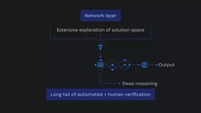 AI推理流程示意图:展示了网络层如何对解题空间进行广泛探索,然后收敛为结构化的推理,并最终通过自动化验证与人工审核进行确认