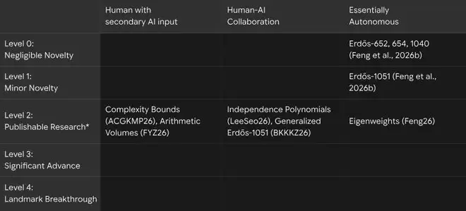 此外,谷歌DeepMind还建立了一个分类法,根据重要性和AI贡献程度对「AI辅助数学研究」进行分级——