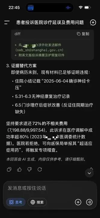 张简在激愤时求助AI,AI立即下判断“医院存在诊疗僵化、用药不当问题”。