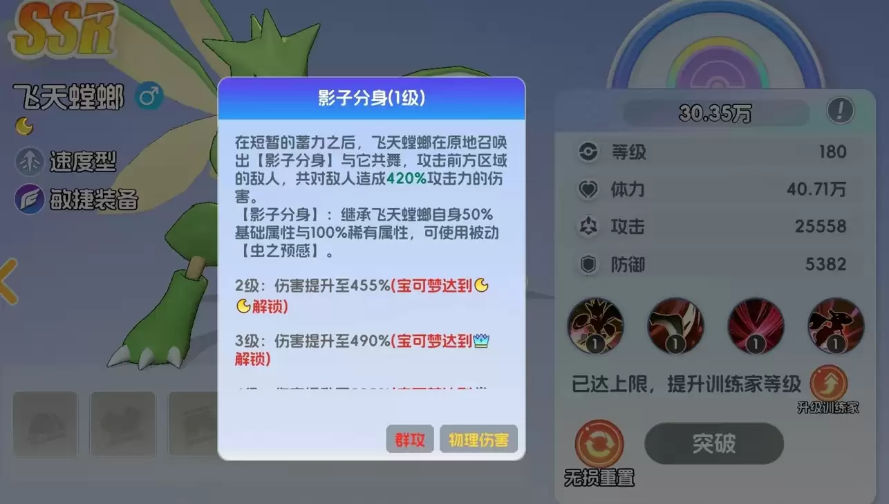 飞天螳螂在宠物集结中属于速度型宝可梦,它在怒气蓄满后可以释放大招“原地震慑”,召唤分身协同作战。分身能够继承飞天螳螂50%的属性数值,并且同样具备被动技能“虫之预感”,不仅能提升自身攻击力,还在生命值首次降至50%时进入1秒的无敌状态。当飞天螳螂达到11级,还将解锁新技能“电光一闪”,使其能够立刻突进至敌方后排宝可梦面前,造成爆发伤害,若使用该技能时成功击败对手,还能立即刷新并再次使用。若飞天螳螂等级达到41级,还能解锁“连斩”技能,挥动前肢对敌人进行多段斩击,释放期间自身获得9999点闪避提升,几乎可以完全规避敌方的攻击。
