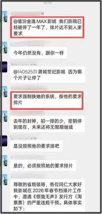 群内多位同行看到控诉纷纷响应,并反馈自身遭遇。有院线负责人称他们影院因为去年的《封神》大年初一排片未达到发行方要求被停了一年密钥,今年仍然没有解封,未来仍将继续。