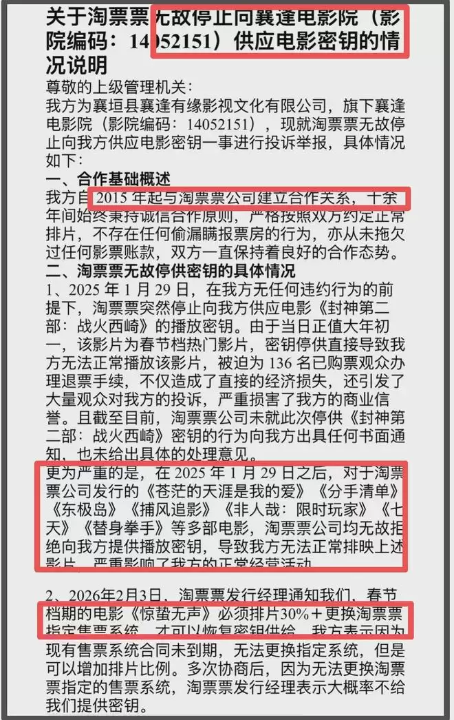 而后,又有一家影院控诉《惊蛰无声》发行方无故停止密钥的文件,称双方合作关系10余年起,在2025年无违约的情况下,突然停止供应《封神2》的密钥,导致给136名顾客退票造成了经济损失。在这之后,该发行方的《捕风捉影》、《东极岛》等多部影片也都停止密钥供给,到了2026年春节档,发行方表示只要给《惊蛰无声》提供30%以上的排片及使用该发行方的售票系统,密钥便恢复。