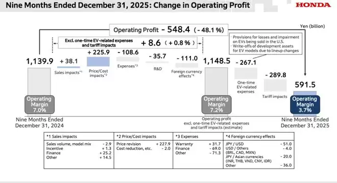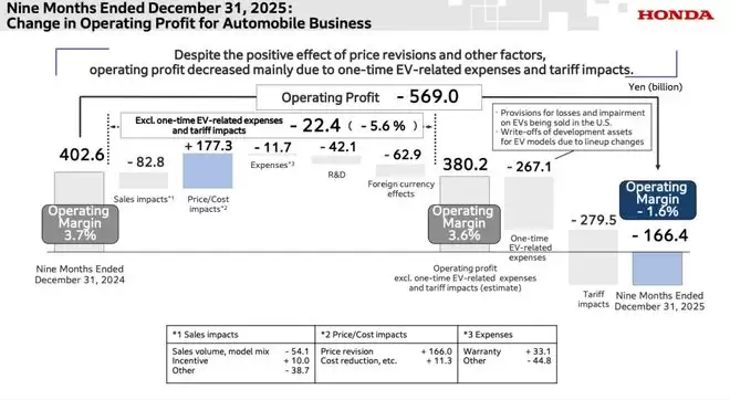 对于前三个财季利润大跌的原因,本田也在报告中直接指出,是来自美国关税的影响以及与电动车相关的一次性费用导致利润下降。