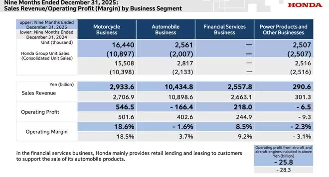 而且两轮业务和四轮业务利润贡献严重失衡,特别是后者,已然成为本田“赤字体质”的主要根源。自2026财年第一季度本田的汽车业务由盈转亏后,已经是连续3个季度亏损。
