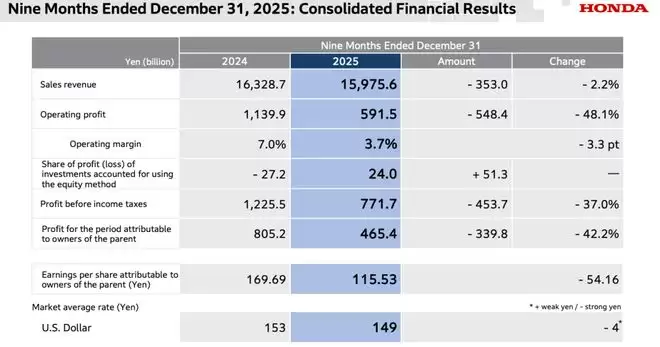 如果将视线放长至本田的前三个财季,截至2025年12月31日的9个月内,公司营业收入15.98万亿日元,同比减少2.2%,经营利润更是暴跌至5915亿日元,相比同期1.14万日元的营业利润,减少了48%。