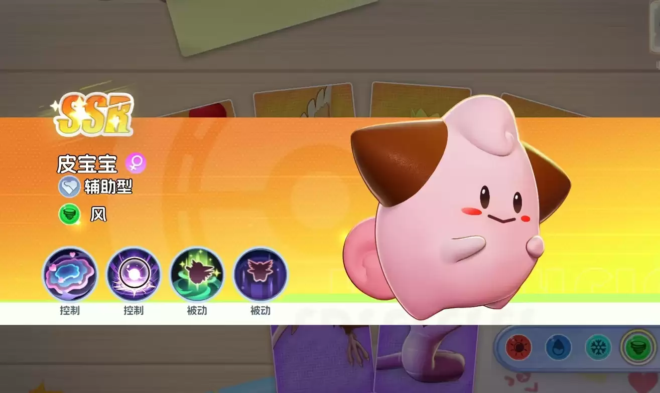 皮宝宝主要通过为敌方施加控制来为队伍做出贡献。它的大招能让敌方陷入着迷,属于超大范围的群控。11级解锁的技能还能主动锁定敌方宝可梦数量多的区域释放,令被命中的宝可梦无法动弹。配合41级的技能治愈波动,还能在释放技能的同时为队友回复血量。
