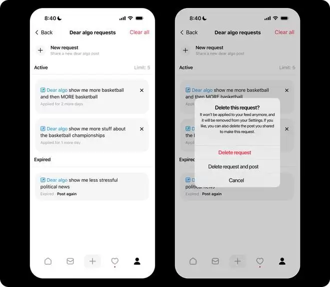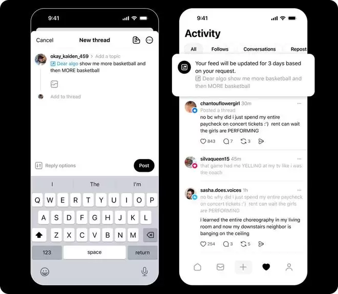 启用“Dear Algo”功能后的三天内,用户可以根据自己的喜好,调整在Threads上刷到的社交媒体内容,实现个性化与自定义的体验。无论你是想多看看体育赛事,还是希望避免被剧透,这个功能都能帮你实现。用户还可以转发他人的“Dear Algo”动态,一键导入别人的偏好设置。