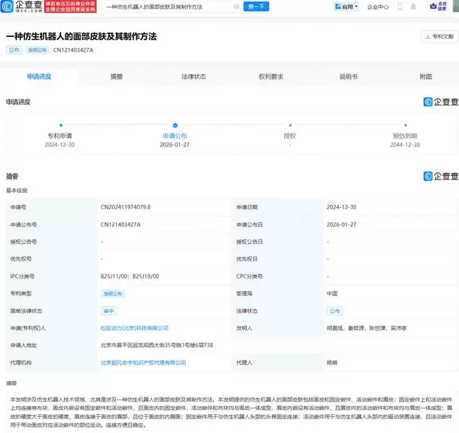 据企查查APP披露,近日,北京松延动力科技集团股份有限公司正式申请并公开了一项名为"仿生机器人面部皮肤及其制作方法"的专利技术。