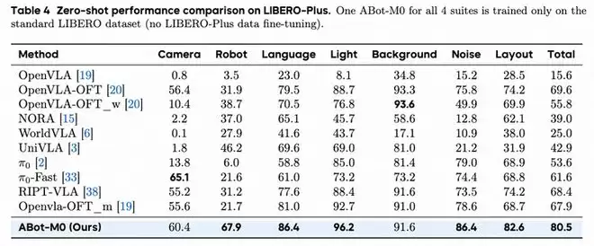 在 Libero、Libero-Plus、RoboCasa 基准测试中,该模型在包含复杂任务组合与动态场景扰动的设定下,平均任务成功率均达到 SOTA。其中,Libero-Plus 基准上达到了 80.5%,较业界先进方案pi0提升近30%,展现了其在高扰动高难度具身操作任务中的领先性能。