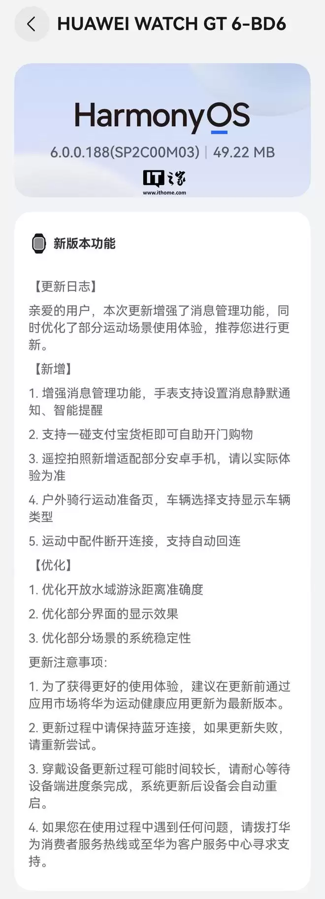 新增 1.增强消息管理功能,手表支持设置消息静默通知、智能提醒 2.支持一碰支付宝货柜即可自助开门购物 3.遥控拍照新增适配部分安卓手机,请以实际体验为准 4.户外骑行运动准备页,车辆选择支持显示车辆类型 5.运动中配件断开连接,支持自动回连优化 1.优化开放水域游泳距离准确度 2.优化部分界面的显示效果 3.优化部分场景的系统稳定性