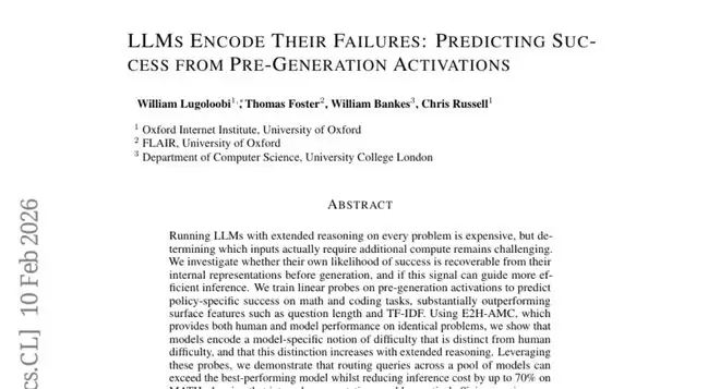这项由牛津大学互联网研究所、牛津大学FLAIR实验室以及伦敦大学学院计算机科学系联合完成的研究,发表于2026年2月10日的arXiv预印本平台(论文编号:arXiv:2602.09924v1 [cs.CL]),为我们揭示了一个令人惊讶的发现:大型语言模型在开始生成答案之前,就已经在内心深处"预感"到自己是否会成功。
