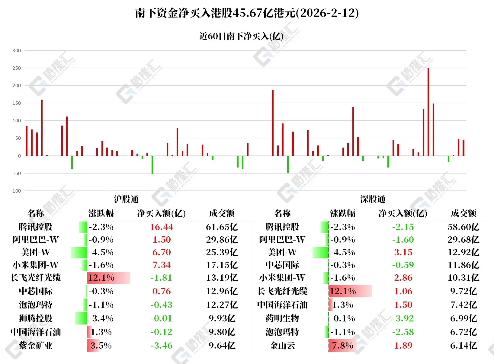 今天是2月12日,港股通南向资金净流入45.67亿港元。具体来看: