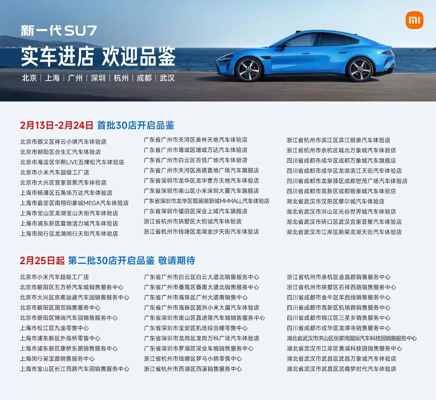 2月13日品鉴小米SU7卡布里蓝,全国7城30店抢先体验