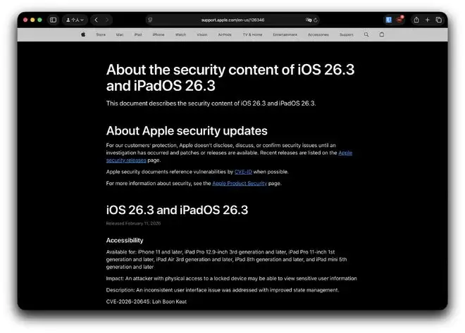 尽管可见变化不多,但 iOS 26.3 内部修复了大量安全漏洞。根据苹果最新文档,本次 iOS / iPadOS 26.3 共修复多达 37 项安全问题。
