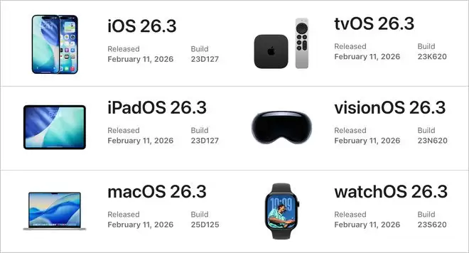 苹果在今天(2 月 12 日)凌晨推送了 iOS 26.3 正式版,同时发布的还有 iPadOS、macOS、watchOS 等系统的 26.3 正式版本。