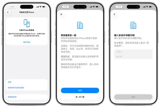 在「传输或还原 iPhone」页面底部,新增了「传输到安卓」入口。相比以往依赖第三方应用的方式,这次是系统级支持,迁移内容更完整,包括信息 App 中的短信数据、eSIM 等。