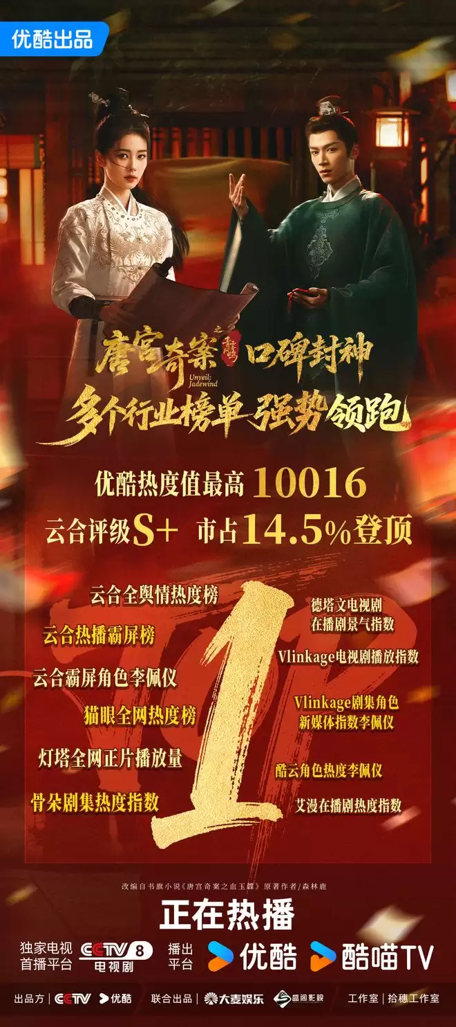 最近,由优酷出品,白鹿、王星越领衔主演的古装悬疑剧《唐宫奇案之青雾风鸣》(以下简称《唐宫奇案》),以开播73小时便实现热度破万、云合市占率榜连续登顶、Netflix台湾地区日榜第一的好成绩,为202