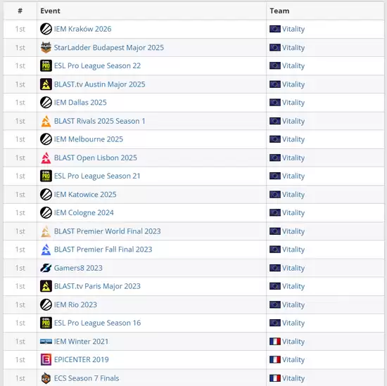 通过在IEM克拉科夫2026赛事中夺冠,Vitality成功超越了Astralis,成为CS:GO与CS2历史上斩获大型赛事冠军数量最多的电竞俱乐部。
