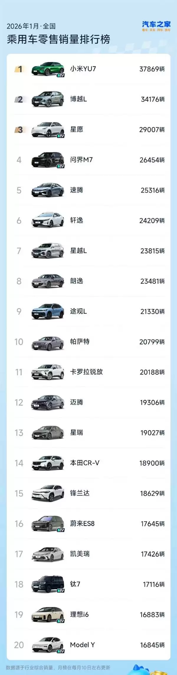 小米汽车近日再传捷报。根据汽车之家最新发布的全国乘用车零售销量数据,小米YU7在2026年1月以37869辆的销量成绩跃居榜首,成为当月中国乘用车市场的销量冠军。这份榜单并未区分能源类型、价格区间或车型类别,涵盖了燃油车与新能源车、SUV与轿车等全品类,被业内视为含金量极高的市场认可。