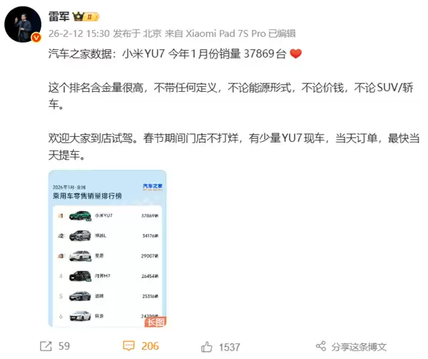从具体数据来看,小米YU7的领先优势相当显著,比第二名博越L的34176辆多出3693辆,星愿、问界M7、速腾、轩逸等热门车型均位列其后。这一成绩也直接推动了小米汽车1月整体交付量突破3.9万辆,其中YU7作为主力车型贡献了绝大部分份额。随着SU7即将迎来改款,当前品牌资源与产能均向YU7倾斜,进一步巩固了它的市场地位。