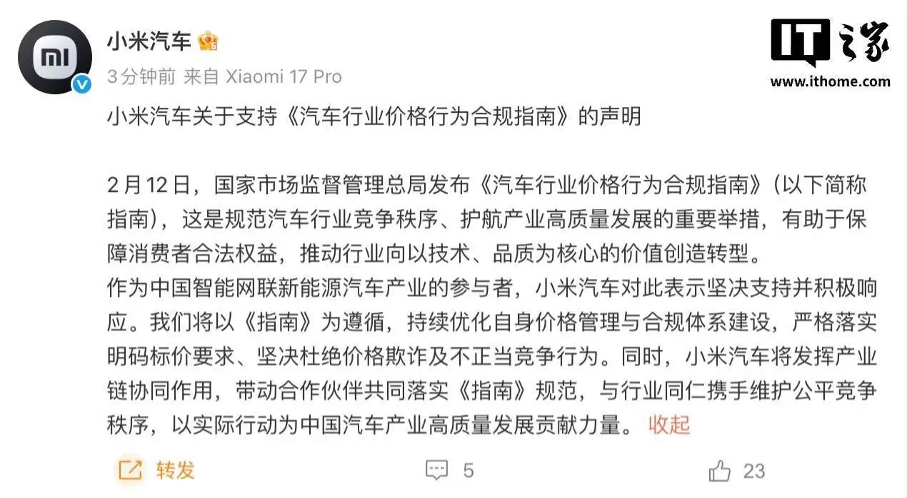 小米汽车响应价格合规指南,推动行业公平竞争与高质量发展