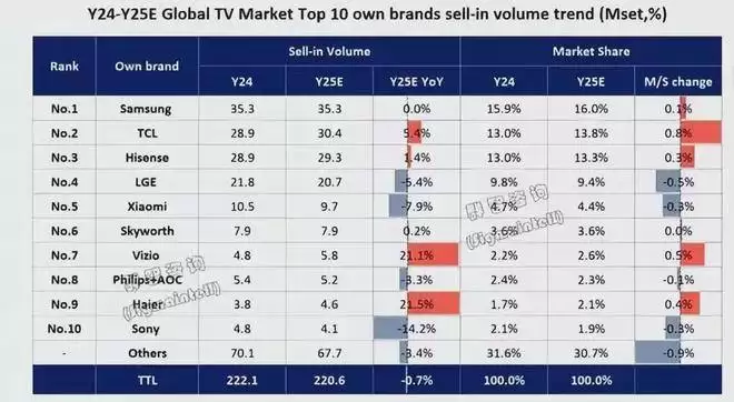 据群智咨询数据,2025年,三星以3527万台出货量、16%的份额勉强守住榜首,但同比增速仅0.1%,增长近乎停滞;海信则以2926万台、13.3%的份额位列第三,同比增长1.4%。