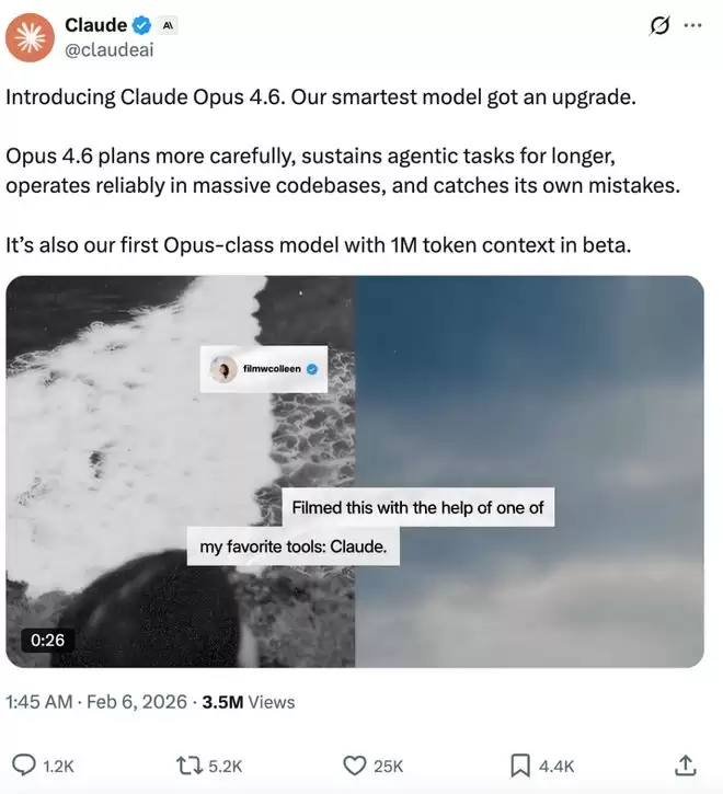 ▲Claude Opus 4.6发布推文(来源:X)