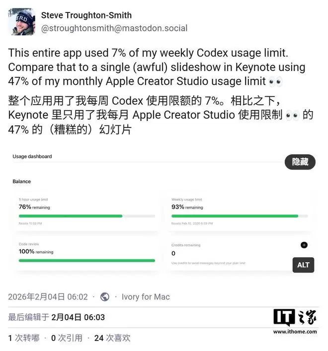 开发者Steve Troughton-Smith的实际体验揭示了显著的用量差异。他在Xcode开发环境中使用基于OpenAI的"Vibe Coding"功能,编写了一个包含1650行代码的应用程序,整个过程耗时约半小时且几乎全自动完成,仅消耗了7%的周额度。