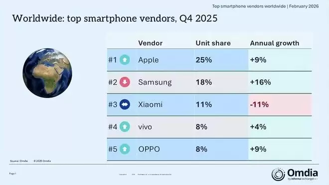 2月12日,知名数据调研公司Omdia正式发布了2025年第四季度全球、中国国内及欧洲市场的智能手机出货数据。报告显示,在过去的2025年第四季度,全球智能手机出货量实现了4%的同比增长。这一增长主要归因于季节性热销以及库存管理回升带来的积极影响。