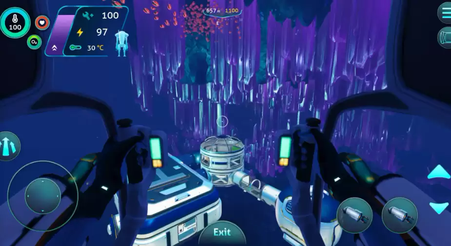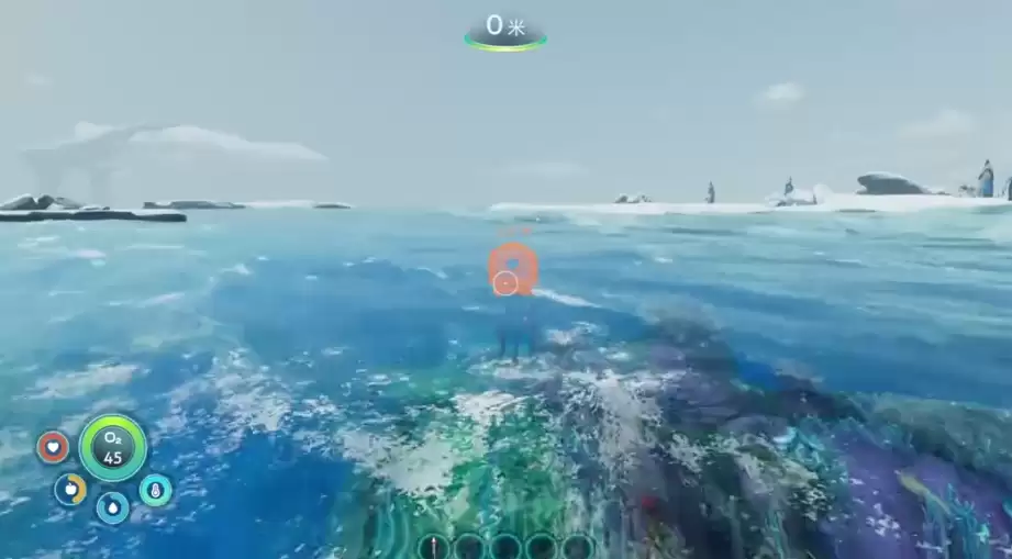 随后玩家就可以直接进入水下开始探险。水面上会受到极寒天气的影响,但一旦潜入水下,就完全不用担心温度问题。水下的资源非常丰富,例如铅块一类的矿物,玩家都可以采集。由于开局时工具较为有限,一些大型物资暂时无法获取,但小型物资仍需留意收集。潜入水下后还需注意一点,那就是氧气含量。当氧气不足时系统会发出提醒,此时你需要迅速上浮补充氧气。这一阶段直接前往吊舱即可补满氧气,吊舱相当于玩家的基地,这里还设有一个工作台,可以帮助你制作其他物品。