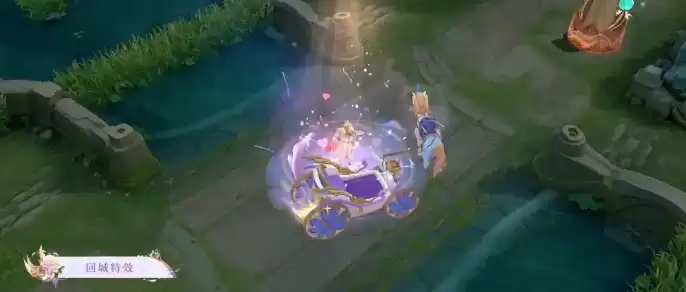 回城动画中,孙策立于城堡露台,肩头小鸟衔来独角兽权杖,远处大乔捧花伫立,夕阳将两人身影镀上金边,全程弥漫飘落的白玫瑰与细碎光点,呼应“漫霞共誓”的誓言主题。