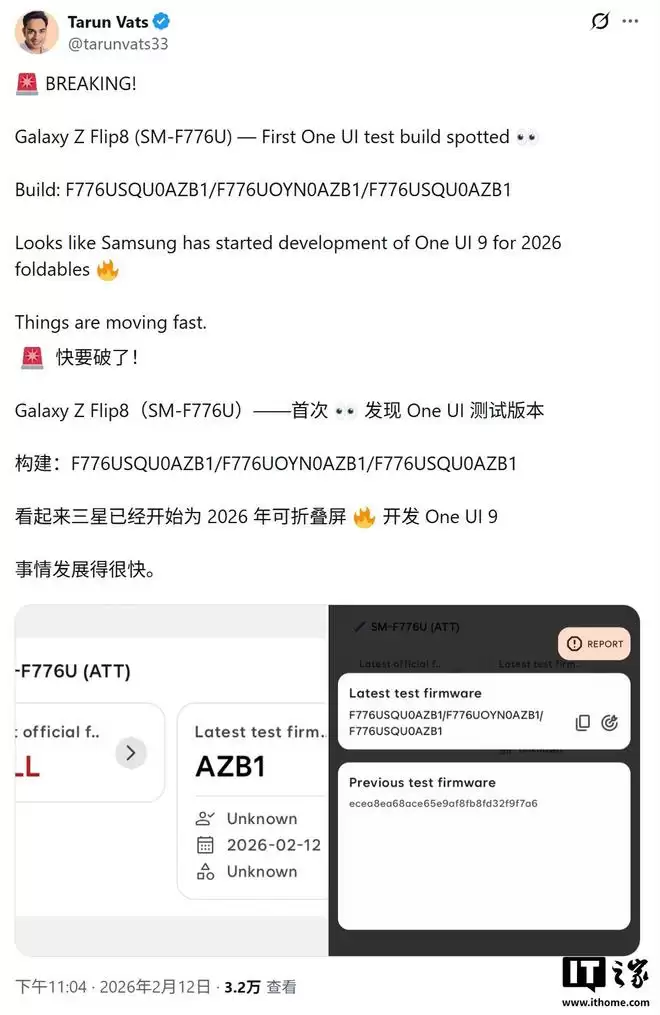 根据推文披露的信息,Galaxy Z Fold 8测试固件版本号为F976USQU0AZB1,而Galaxy Z Flip 8(型号SM-F776U)对应的固件版本则为F776USQU0AZB1。