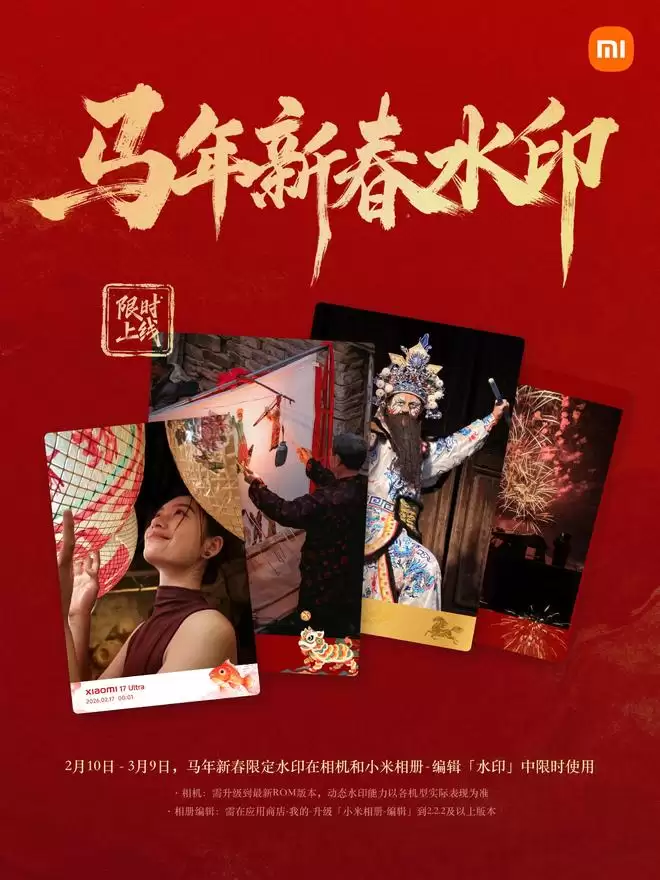 2026年2月13日消息,小米澎湃OS 3系统正式上线了农历马年春节专属功能,包括动态水印定制以及充满年味的"新春特效"相册AI编辑玩法。