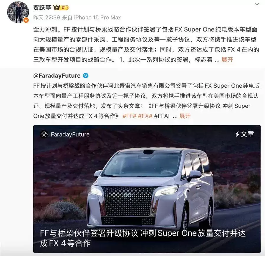 贾跃亭在社交媒体透露,此次合作标志着FF"桥梁战略"进入新阶段,双方将全力确保2026年第二季度实现Super One规模化交付。这个时间节点对FF至关重要——作为造车新势力元老级品牌,FF91从2017年首发到2024年首台交付耗时六年,期间多次陷入资金链危机。当前资本市场对FF的耐心已接近临界点,Super One的量产进度直接关系到品牌存续。