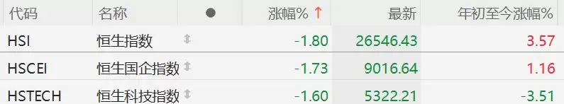 港股市场跌势延续,恒生指数下滑1.8%,恒生国际指数下跌1.7%,恒生科技指数跌幅达1.6%。