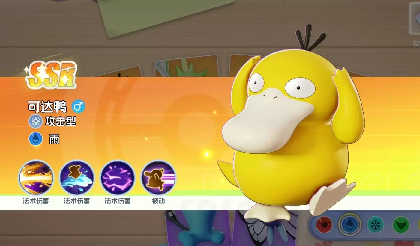 兼顾了输出与控制的可达鸭也是玩家免费就能拿到的宝可梦,它可通过被动和41级技能令敌人陷入无法动弹的状态,配合上大招的高爆发群伤,能稳定地在战斗里打出可观的法术伤害。即便在被近身时,解锁了11级技能的可达鸭还可通过击退敌方来保护自己。