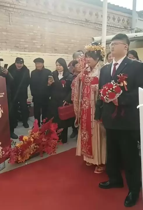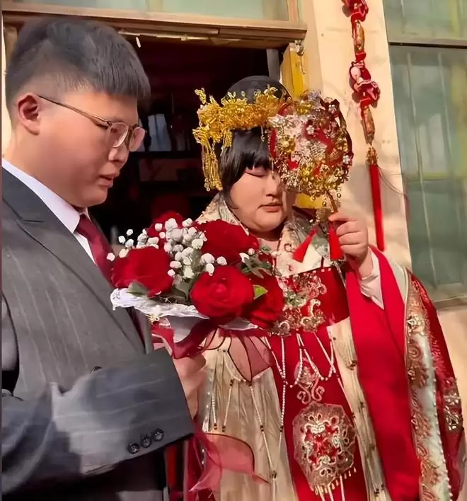朱雪梅当天穿着新娘服,感觉像是唐代的丰腴美人一样。