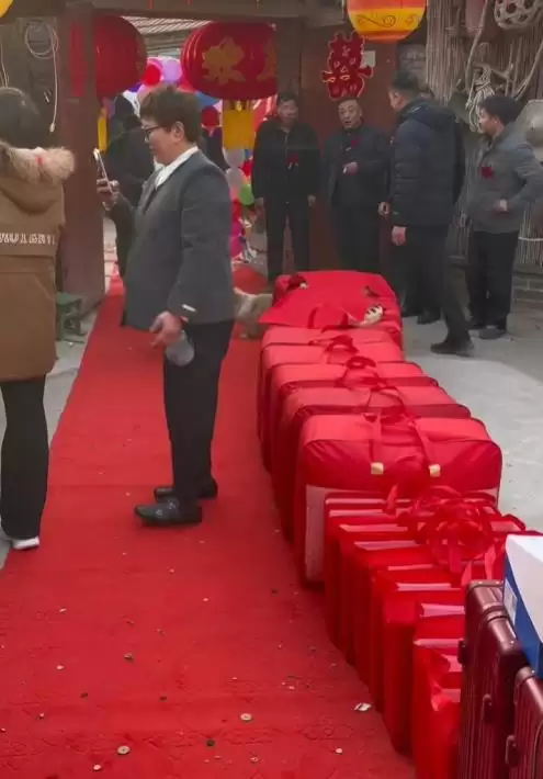 大衣哥家的院子里已经堆满了陪嫁的喜被和礼盒,还有准备的手提箱。