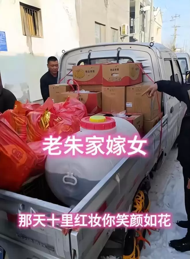 在迎接朱雪梅之前,新郎家的聘礼也是下得特别重,村民都是用卡车搬,花钱又有派头。