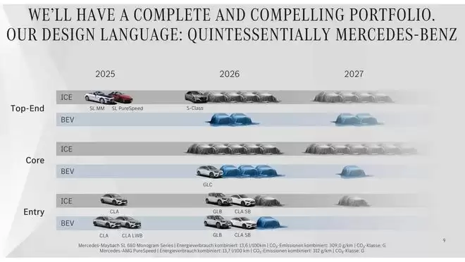 2026年内,奔驰计划推出至少16款新车型,2027年的发布数量预计也将与此相近。这其中,燃油车型仍占多数,不过到明年年底前,多款全新或改款的纯电车型也将陆续登场。