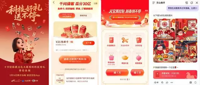 公开数据显示,阿里、腾讯、百度三家头部企业春节营销投入超45亿元,字节跳动旗下豆包大模型宣布送出科技好礼及现金红包。四家企业将各自最核心的生态优势化作新年福利,推向全国用户。