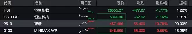 2月13日,文化传媒主题指数中,光线传媒涨幅达15.3%,掌阅科技上涨10%。AI应用指数中,深科技涨幅达10.02%,风语筑上涨9.98%。在恒生指数与恒生科技指数双双走弱的背景下,智谱、MiniMax逆势走强,分别上涨13.78%、9.86%,盘中两家公司市值交替领先。截至发稿,智谱市值暂时反超,达到上市以来新高。