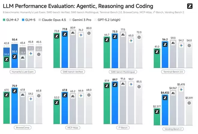 橘子认为智谱敢于给自己涨价,主要基于几方面原因考量:GLM-5 Coding能力逼近Claude Opus 4.5,已经能够自主完成后端重构、深度调试、长程规划与执行,朝着资深架构师方向迈进。其次,在BrowseComp、MCP-Atlas、τ²-Bench三个Agent评测基准上,GLM-5均为开源第一,在模拟经营类Vending Bench 2的测试中,GLM-5实现账户余额4432美元的成绩,接近Opus4.5。