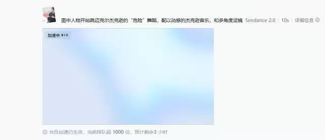 在国内,随着Seedance2.0知名度的提升,相关AI生成视频的传播也越来越广,引发“全民狂欢”,2月13日,新京报贝壳财经记者再次使用即梦生成视频时,被提示“当前排队超1000位,预计剩余3小时”。
