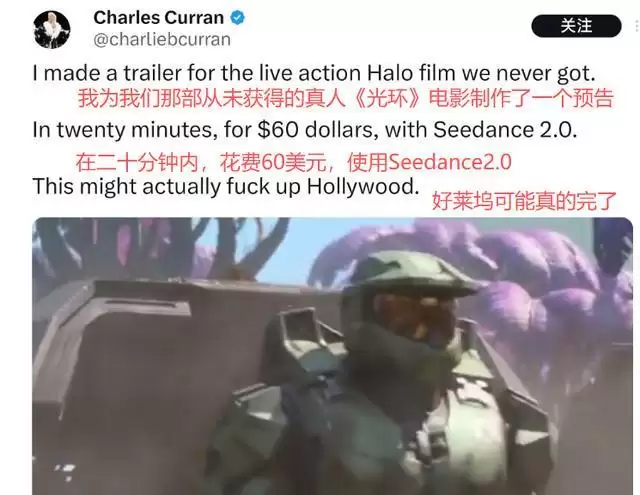 好莱坞导演们更是集体“破防”。导演查尔斯·柯兰(Charles Curran)表示,只需20分钟、60美元,就能做一部电影预告;导演安德鲁·奥莱克(Andrew J. Oleck)说:“一个提示词就能做十几秒的视频”;导演布雷特·斯图尔特(Brett Stuart)已准备好用Seedance2.0拍片,他表示“只需1个提示词,指定5个镜头,以及一张图片,就能生成动画短片。”而在网上“激情发帖”的最后,上述导演不约而同总结道:“好莱坞完蛋了”。