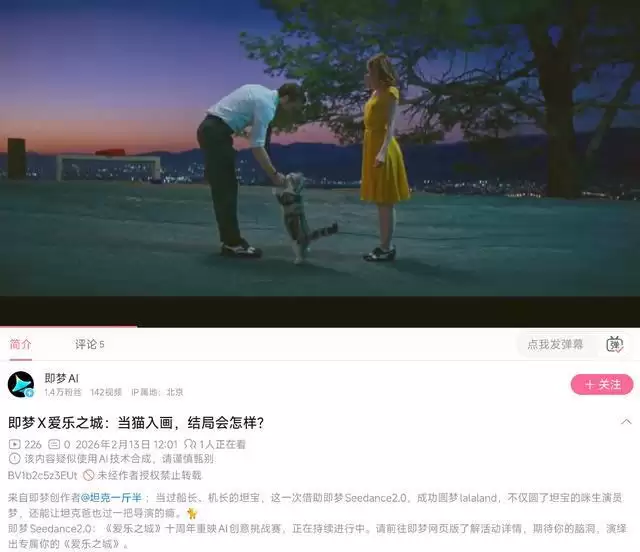 2月13日中午,贝壳财经记者注意到,即梦AI在最新B站账号上上传了3条爱乐之城主题的AI生成视频,视频的最后明确标明“素材由最新合作授权”。这或许是一次积极尝试。