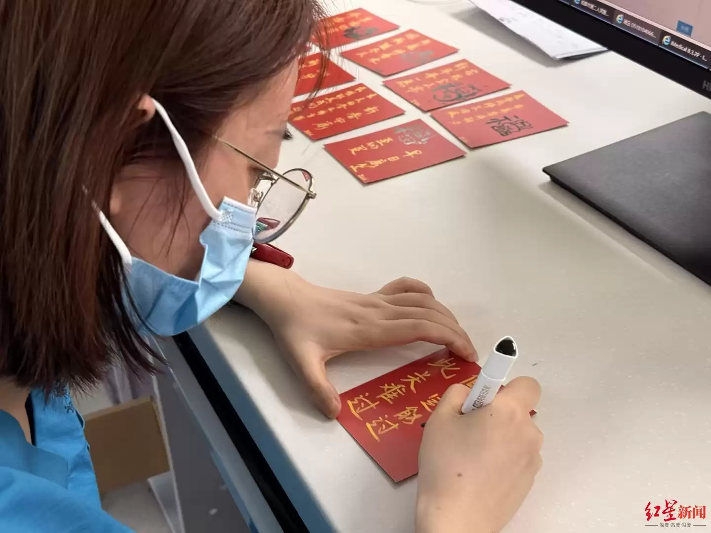 2月13日上午,四川大学附属成都市第二人民医院龙潭院区重症监护室(ICU)里,主治医师周云利用工作间隙,小心翼翼地用彩笔在一张张空白贺卡上勾勒。红色的“福”字旁,她写下一句句祝福语。今天,她和同事们