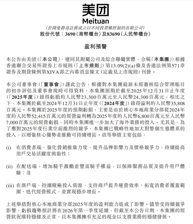 美团在公告中给出明确指引:尽管公司持续调整经营策略,但受持续竞争影响,亏损趋势预计将在2026年第一季度延续。这意味着管理层并未暗示“2025年是一次性冲击”,而是提示竞争仍在、利润修复需要时间窗口。