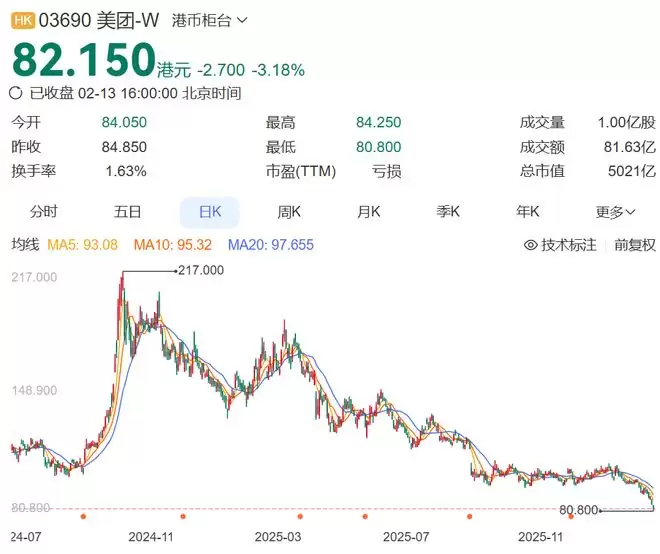 受外卖价格战、收购整合以及盈利预期影响,美团股价自1月高点下跌22.5%,市值一度跌破5000亿港元。截至2月13日收盘,美团股价为82.5港元。